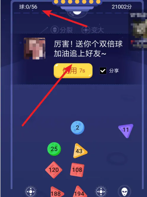 另外,有一个可赠送的道具叫双倍球,它能让自身拥有的球数量翻倍。例如,若当前有56个球,使用后就会变为56×2个球。不过要注意,这个道具是一次性的,仅在一轮攻击中有效。