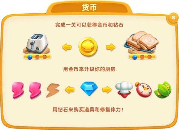 1、金币:成功通关后,可获取本关卡所产出的金币(双倍加成道具与连击都能提升金币产出量);金币主要用于升级设备以及购买食材。