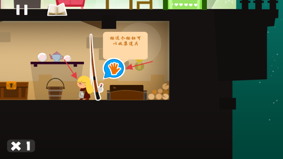 3、依照提示点击手掌形状的按钮,收集场景里的道具,推动任务进展。