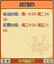 如果指定时间内选择“大选报名”便可以直接报名国公竞选,自动扣除30万报名费在“关于选举”中对参加选举报名时间和投票时间有说明。
