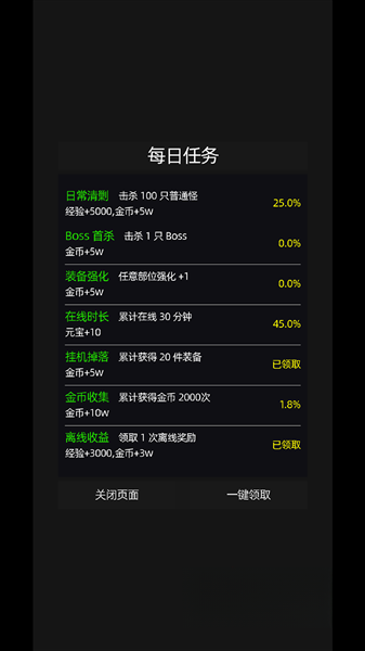 1、挂机战斗是核心玩法,无需手动操控,英雄将自动展开战斗,获取经验、金币、装备以及资源。