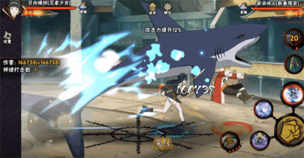 在高伤害连招方面,鲨鱼通灵起着至关重要的作用。日向雏田「忍者少女」的一技能命中后,在一定时间内所有攻击的暴击率都会得到提升,配合鲨鱼通灵释放二技能并开启大招,能在极短时间内打出令人难以置信的恐怖伤害,豚豚不禁猜测,鲨鱼这一口难道是咬到动脉了?