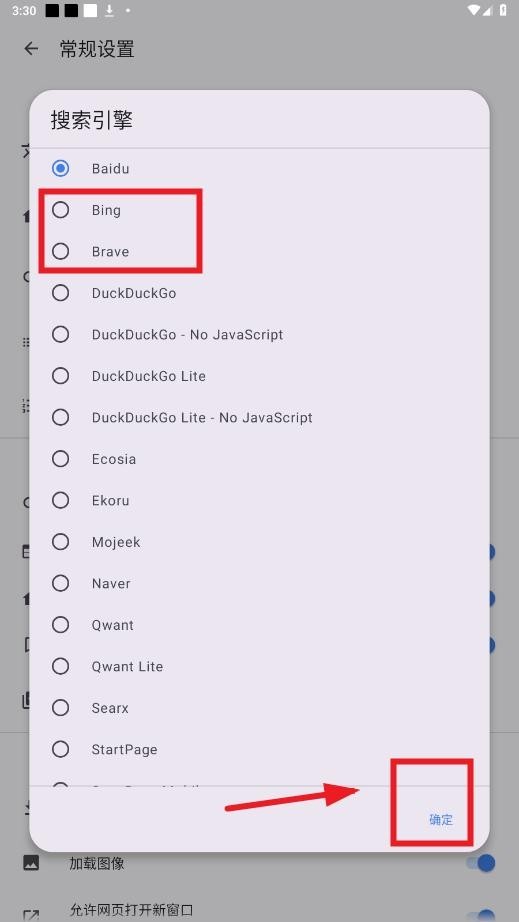 4、点击搜索引擎选项,从中挑选你想要切换的搜索引擎,随后点击“确定”按钮。