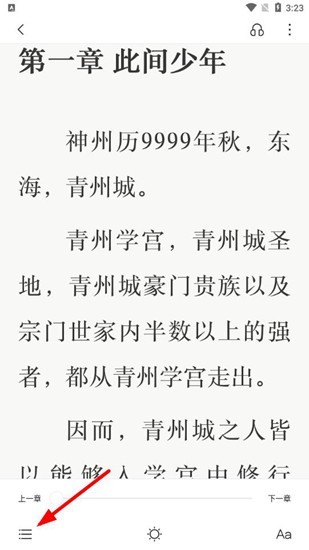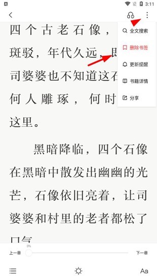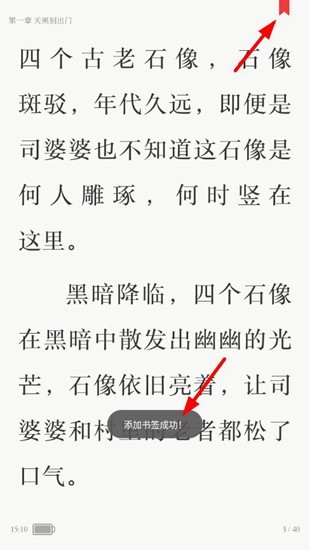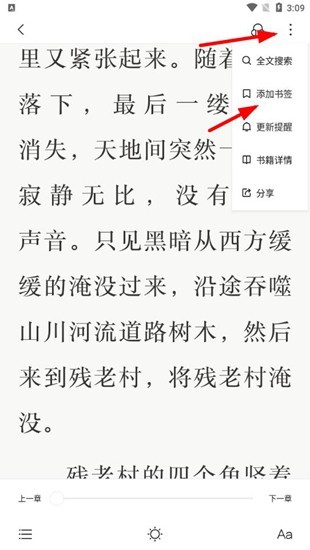 1.打开软件并进入小说阅读界面,轻点屏幕中央,唤出菜单栏,接着点击右上角的功能选项,从中选择【添加书签】。
