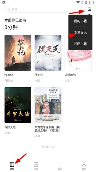 1. 首先要在【书架】中,借助左上角的功能选项寻找到【本地导入】这一选项。