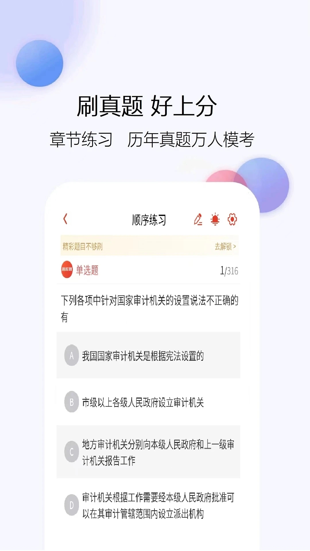 初级审计师题库网是一个移动学习平台,它汇聚了海量的题库资源,能帮助用户高效地学习与练习。在这里,用户可以轻松驾驭多种练习模式,随时查看自身的学习进度。平台所有的学习资源都免费开放,用户通过不断练习,能大幅提升备考效率以及考试通过率。而且,每次学习活动的历史记录都会自动保存,方便用户随时回顾并接着学习。