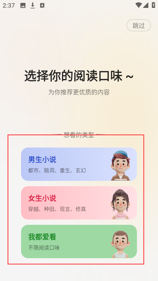 2. 在首次运行之际,系统将引领用户依据个人喜好来定制阅读偏好。